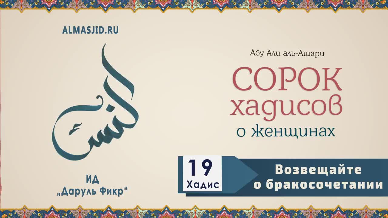 Мировоззрение 13.24 Mb 04:20 13.09.2019, 14:54 0 0 Необходима авторизация. Войти Возвещайте о бракосочетании - 19 Хадис - 40 хадисов о женщинах jama-221 Подписаться Подписка оформлена 445 9831 видео 0% 154 просмотров 0 проголосовавших Только зарегистрированные пользователи могут оставлять комментарии. Войдите, пожалуйста. Сначала новые Сначала новые Сначала старые Сначала популярные Возможно, Вас заинтересует 0 04:24 Жена должна почитать мужа - Пятый хадис - 40 хадисов о женщинах 12.09.2019 297 0 1 05:42 Подчинение мужу - Шестой хадис - 40 хадисов о женщинах 12.09.2019 220 0 0 03:19 Мужчинам запрещено заходить к чужим женщинам - Седьмой хадис - 40 хадисов о женщинах 12.09.2019 256 0 0 02:37 Отдельный вход для женщин в мечеть - Восьмой хадис - 40 хадисов о женщинах 12.09.2019 326 0 1 03:40 Ангелы проклинают покинувшую ложе мужа - Девятый хадис - 40 хадисов о женщинах 12.09.2019 273 0 1 04:20 Будьте благодарны своим мужьям! - Десятый хадис - 40 хадисов о женщинах 12.09.2019 306 0 0 06:16 Удивительный поступок Айши رضي الله عنها - Одиннадцатый хадис - 40 хадисов о женщинах 12.09.2019 272 0 0 05:11 Выбирайте богобоязненных! - Двенадцатый хадис - 40 хадисов о женщинах 12.09.2019 232 0 0 03:24 Праведная жена - это сокровище - Тринадцатый хадис - 40 хадисов о женщинах 12.09.2019 272 0